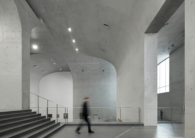 由大舍建筑设计的龙美术馆,位于上海市徐汇区的黄浦江滨。原先的场地是运煤的码头。作为改造,新的设计采用独立墙体的“伞拱”悬挑结构,呈自由状布局的剪力墙插入原有地下室与原有框架结构柱浇筑在一起,地下一层的原车库空间由于剪力墙体的介入转换为展览空间,地面以上的空间由于“伞拱”在不同方向的相对联接形成了多重的意义指向:层层跌落的阶梯空间联接,既原始又现实的空间和古代、近代、现代直到当代艺术的展览陈列,这种并置的张力,呈现出一种具有时间性的展览空间。