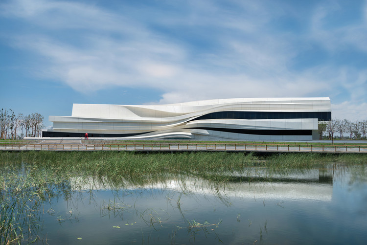 由waa未觉建筑设计的银川当代艺术馆位于黄河边,美术馆外观的设计正是基于这千年间地貌的变化,以流动的皱褶肌理还原了千百年间塑造了如今地貌的沉积岩运动,同这片土地千年前的过往发生着对话。美术馆的外观犹如一个“运动中”的地质断面,暗喻着这片土地千年间的变化,亦传达了这片土地的源头——黄河——丰富、多变的性格;而其流畅、优雅的线条,又给人以轻盈的印象,仿佛是“降落”在大地上,自成大地的景观。