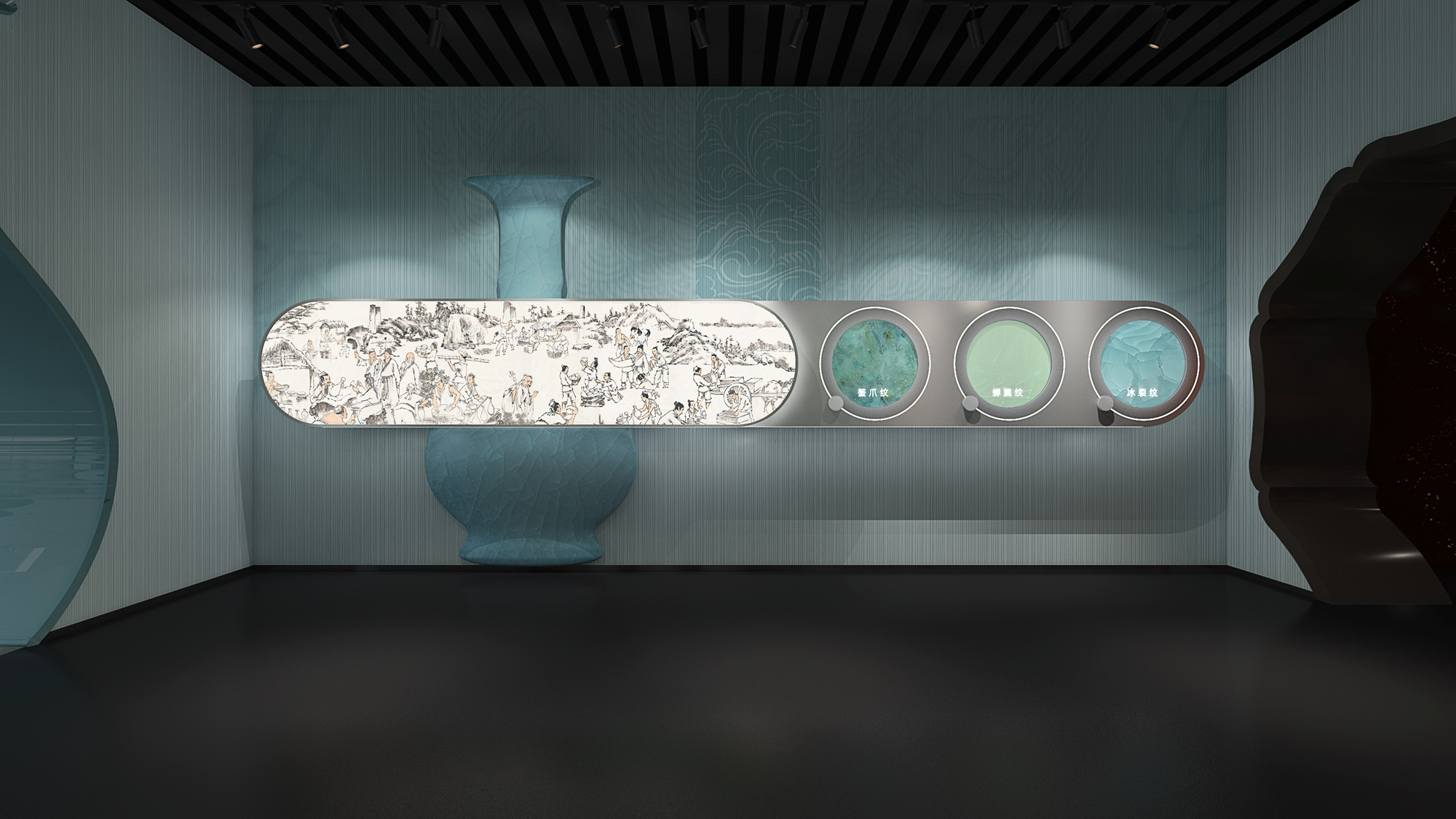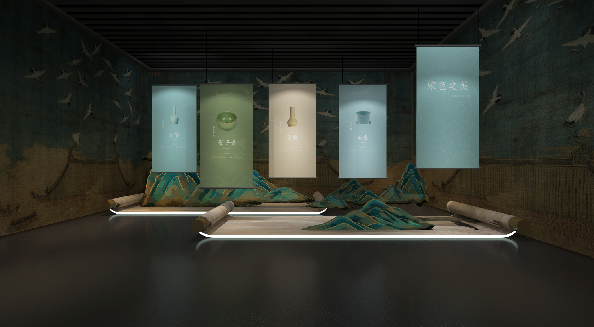 踏入展区,仿若踏入梦幻之境。借助艺术纱幕、灵动光影与特效音效的绝妙组合,“徽宗之梦・雨过天青”徐徐展开,瞬间将参观者裹挟进宋徽宗笔下 “雨过天青云破处” 的诗意天地,仿若亲身漫步于那如梦如幻的天青梦境。