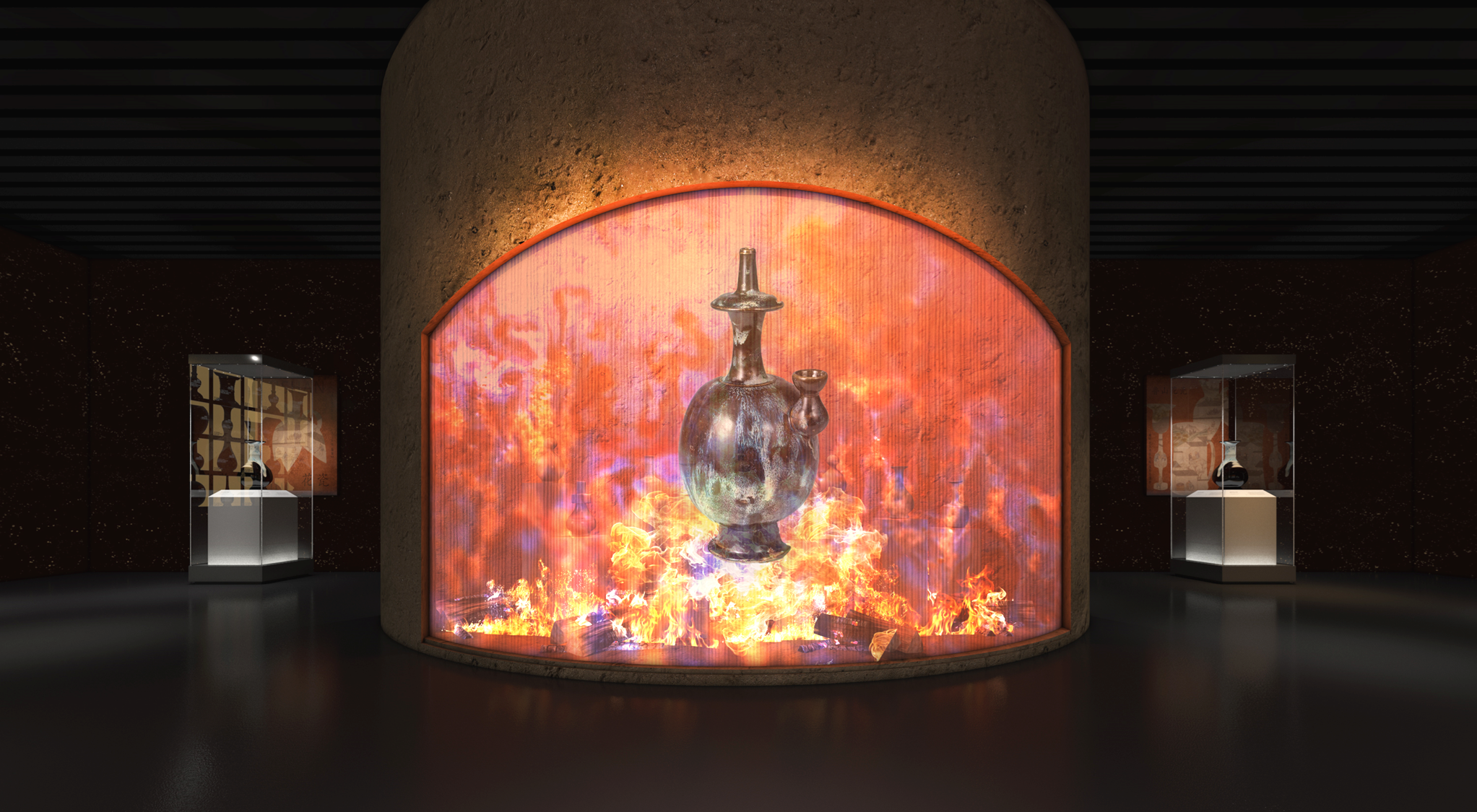 钧瓷的窑变之美更是令人称奇。互动展项《窑火斑斓》通过3D光影雕刻、纱幕投影与互动触控屏的完美融合,加入炉温互动设计,让观众近距离感受“入窑一色,出窑万彩”的绚丽奇观,深度参与这场艺术的奇幻旅程。